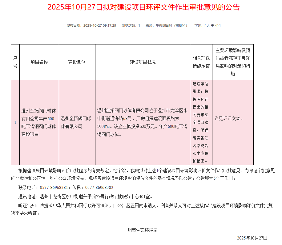 2025年10月27日,溫州市生態(tài)環(huán)境局就溫州金拓閥門(mén)球體有限公司年產(chǎn)600噸不銹鋼閥門(mén)球體建設項目環(huán)境影響報告表作出審批意見(jiàn)并對外進(jìn)行公告,公告期:5個(gè)工作日。